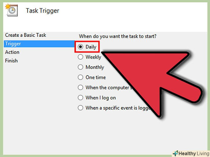 Виберіть частоту.виберіть опцію " Daily "на сторінці" Task Trigger " і натисніть Шаблон:кнопку. Виберіть час, коли хочете, щоб ваш комп'ютер вимикався щоночі. Залиште " Recur ever: X days "у значенні"1". Натисніть Шаблон: кнопку.