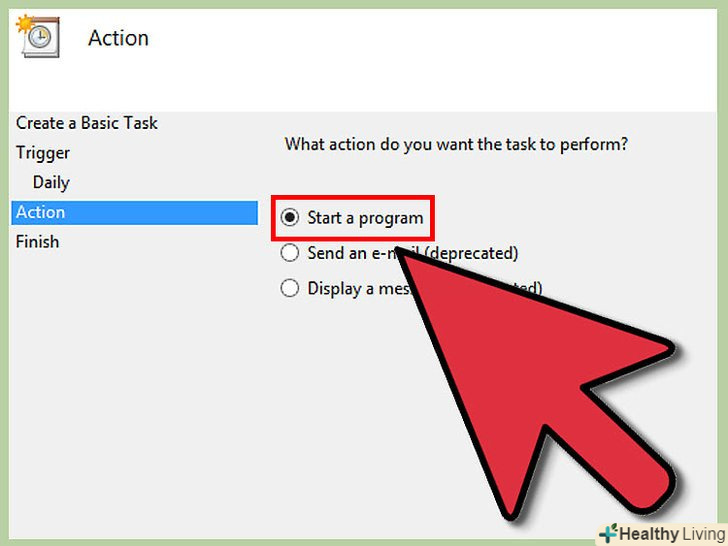 Виберіть "Start a program".ця опція буде на екрані "Action "" і повинна бути обрана автоматично. Натисніть Шаблон: кнопку для продовження.