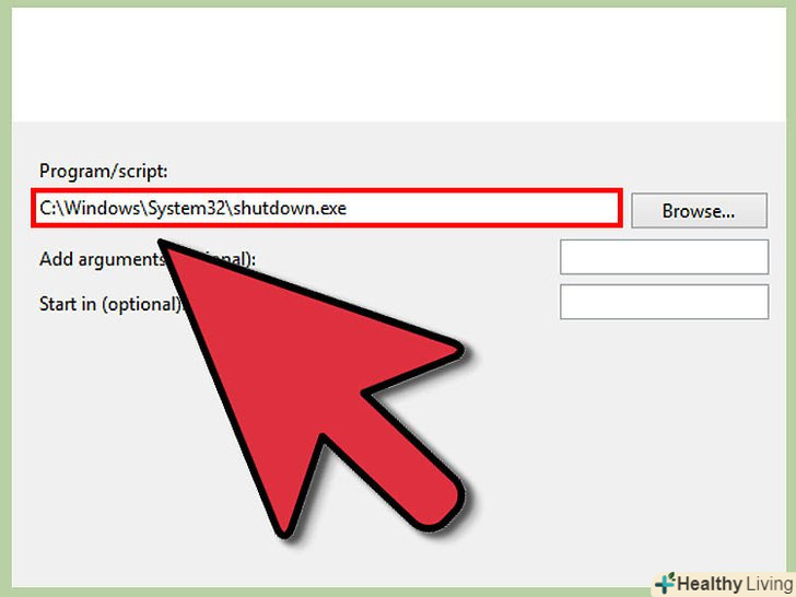 Введіть місце розташування для програми відключення.коли Windows вимикається, вона насправді запускає програму відключення. У полі "Program/script" введіть C:\Windows\System32\shutdown.exe.- У полі "Arguments" введіть/s. Натисніть Шаблон: кнопку.