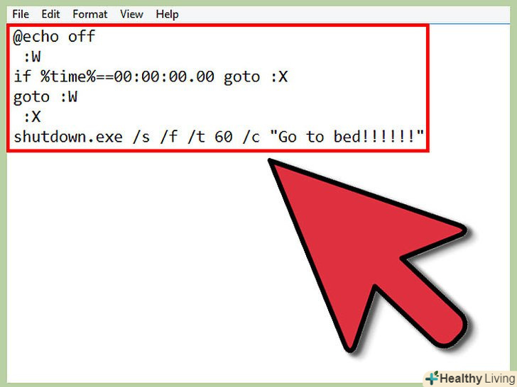 - Ця інформація постійно перевіряє час, щоб побачити, опівночі це, і якщо це так, вона вимикає комп'ютер з повідомленням " Ідіть спати!!!!"