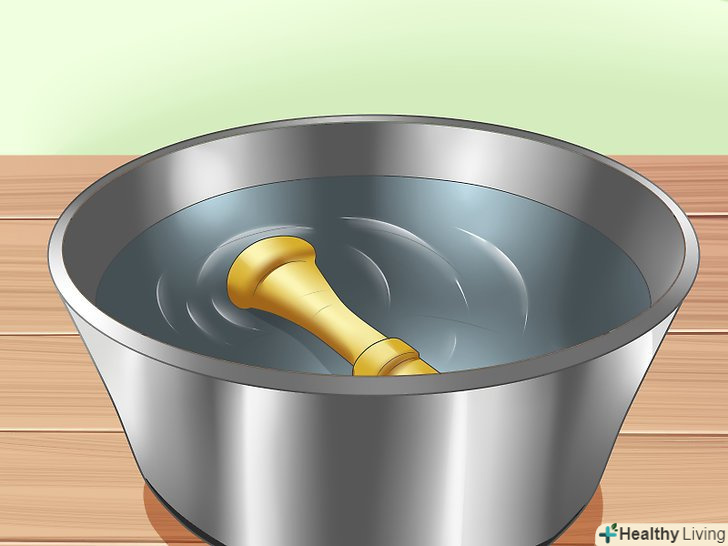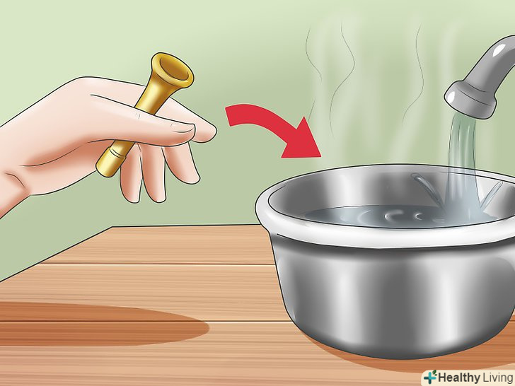 Поки труба знаходиться у воді, промийте мундштук дуже гарячою мильною водою.протріть мундштук ганчіркою з милом. Крім того, якщо у вас є щітка для мундштука, почистіть його зсередини, щоб видалити залишилася бруд.