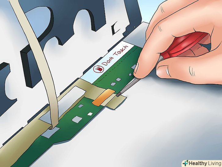 Після того, як ви покладете екран на клавіатуру, ззаду екрану ви побачите шлейф; це відеокабель.видаліть липку стрічку, яка кріпить кабель до екрану, і від'єднайте відеокабель, акуратно витягнувши його з роз'єму.- На деяких ноутбуках відеокабель може фіксуватися спеціальним механізмом. В цьому випадку спочатку відкрийте такий механізм, а потім від'єднайте відеокабель, акуратно витягнувши його з роз'єму.