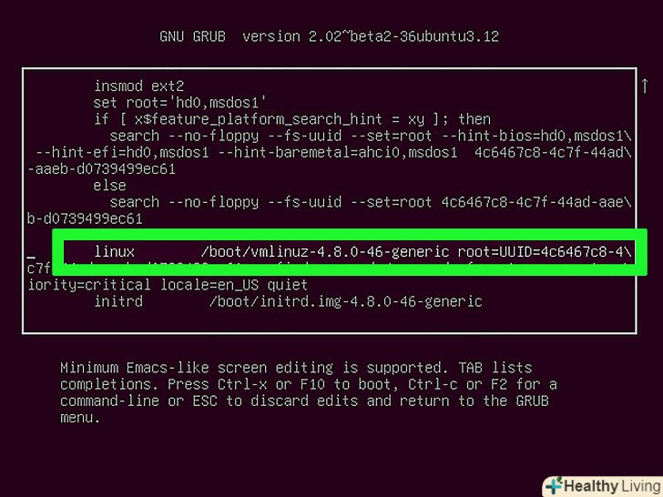 НатиснітьE В меню GRUB. [3] це меню з'явиться відразу після перезавантаження комп'ютера. У більшості випадків воно буде відображатися на екрані протягом дуже короткого проміжку часу.- Якщо ви не встигли натиснутиE, і меню GRUB зникло з екрану, перезавантажте комп'ютер і спробуйте знову.
