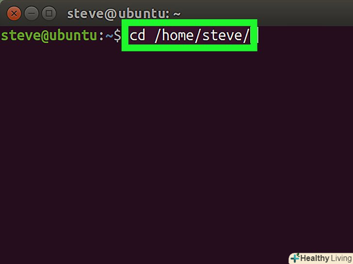 Введіть команду "change directory" (змінити каталог). Введіть cd /home/username/, де замість «username» підставте своє ім'я користувача, а потім натисніть ↵ Enter. Так ви переміститеся з поточного каталогу в папку»home".- Наприклад, якщо ваше ім'я користувача «boris», введітьcd /home/boris/.