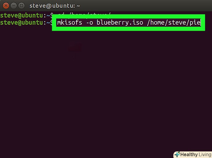 Введіть команду, яка створить ISO-файл. введіть mkisofs-o destination-filename.iso / home/username/folder-name, де замість «destination-filename» підставте ім'я майбутнього ISO-файлу, а замість «folder-name» – назва папки, в якій зберігаються файли, на основі яких буде створений ISO-файл.- Наприклад: щоб створити ISO-файл під назвою «blueberry» з файлів у папці «pie», введітьmkisofs-o blueberry.iso/home/username/pie.