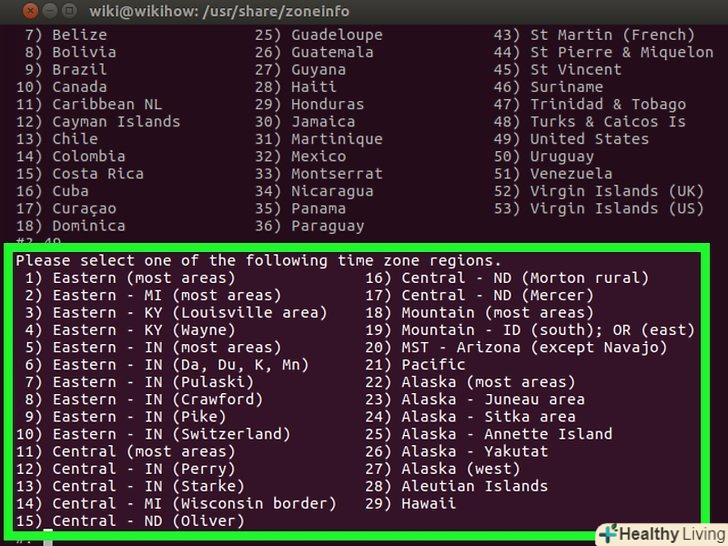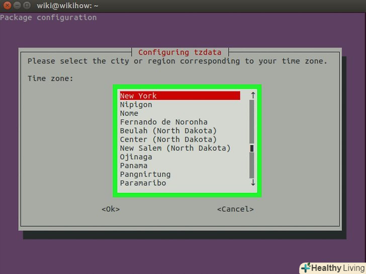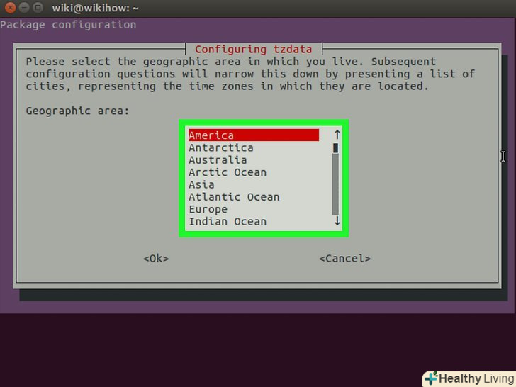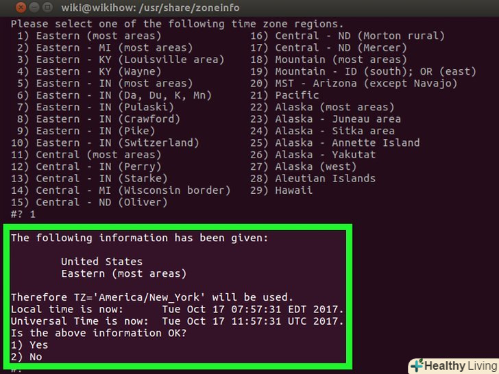 Виберіть часовий пояс. введіть номер бажаного часового поясу і натисніть ↵ Enter.- Якщо вашого міста немає в списку, виберіть інше місто з того ж часового поясу.
