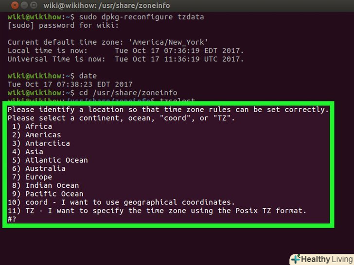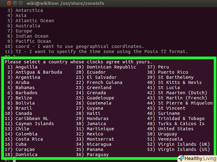 Відобразіть доступні часові пояси. Введіть cd /usr/share/zoneinfo натисніть ↵ Enter, після чого введіть tzselect і натисніть ↵ Enter, щоб відобразити список місць.- Шлях/usr/share/zoneinfo може бути іншим залежно від дистрибутива Linux.