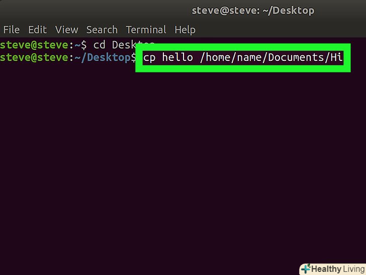 Введіть шлях до папки, в яку хочете скопіювати файл.- Наприклад, щоб скопіювати файл «hello» в папку «Hi», яка знаходиться в папці «Documents», в терміналі введітьcp hello /home/ім'я/Documents/Hi (де «ім'я» — це ваше ім'я користувача).