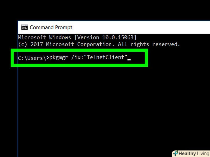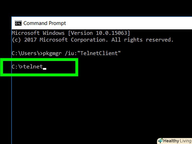 Встановіть утиліту "Telnet".у більшості нових версій Windows (Windows Vista/7/8/10) цієї утиліти немає; Telnet являє собою утиліту-клієнт, який необхідний, щоб підключитися до фільму в ASCII-символах. Якщо ви ввійшли в систему як адміністратор, Telnet можна встановити за допомогою командного рядка.- Введітьpkgmgr /iu: "TelnetClient" натисніть ↵ Enter.