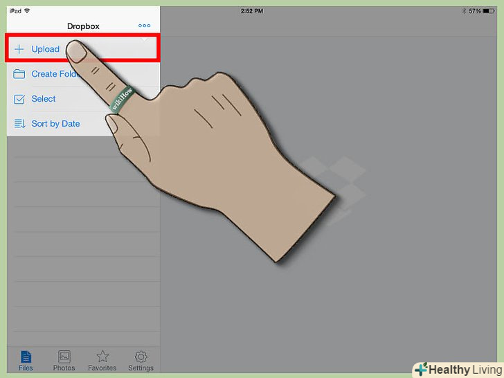 Клікніть по вкладці Dropbox, яка зовні нагадує відкритий ящик.натисніть на знак "плюс" для завантаження файлів або створення папок.- Якщо ви щось зберегли в Dropbox на інших своїх пристроях, то повинні побачити ці дані тут.