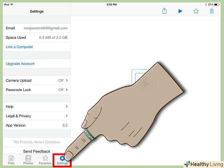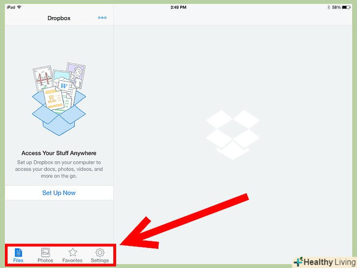 Зверніть увагу на 4 іконки в нижній частині вкладки Dropbox. вони є основними функціями програми: files( файли), favorites (вибране), photos (фотографії) і settings (Параметри).