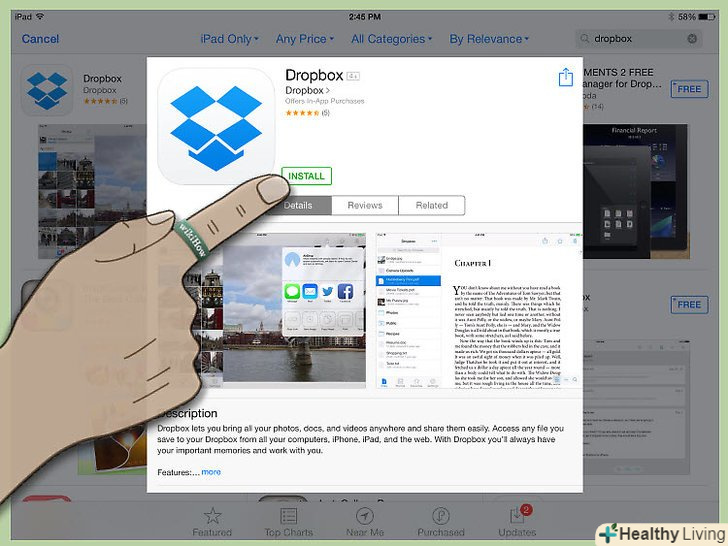 Виконайте пошук за запитом "Dropbox".Скачайте додаток і встановіть його.- Вам, можливо, знадобиться час для завантаження Dropbox на свій iPhone і комп'ютер. Ваш з'єднаний аккаунт дозволить обмінюватися файлами між пристроями.