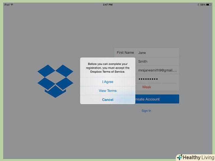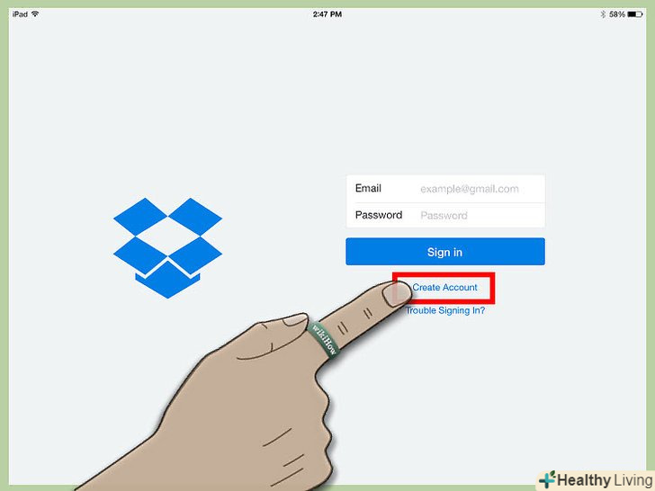 Створіть акаунт при відсутності такого досі.введіть адресу електронної пошти та пароль, які ви хотіли б пов'язати з усіма своїми пристроями.- Наприклад, якщо ваш обліковий запис Dropbox буде застосовуватися на персональних пристроях, то потрібно вказувати свою особисту електронну пошту. Якщо ваш аккаунт Dropbox використовується на робочому пристрої, то необхідно вводити робочу адресу електронної пошти.