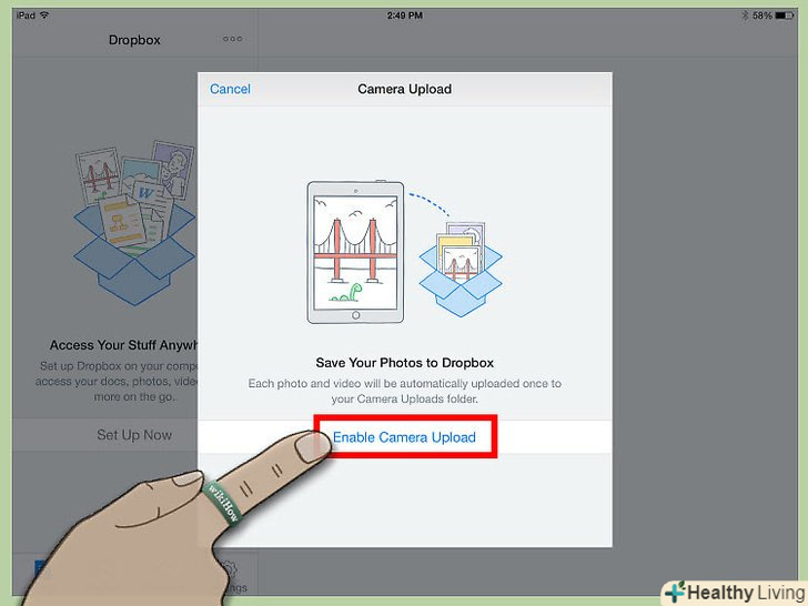 Вкажіть вашу іншу особисту інформацію.перевірте в кінці свої дані.- Dropbox запитає, чи хочете ви автоматично завантажувати свої фотографії. При позитивній відповіді включите синхронізацію фотопотоку. Безкоштовний обліковий запис Dropbox надає обмежене місце для зберігання, так що при бажанні використовувати Dropbox для документів і файлів меншого розміру Ви маєте право натиснути на кнопку «Cancel» (скасування).