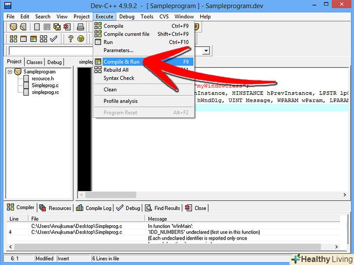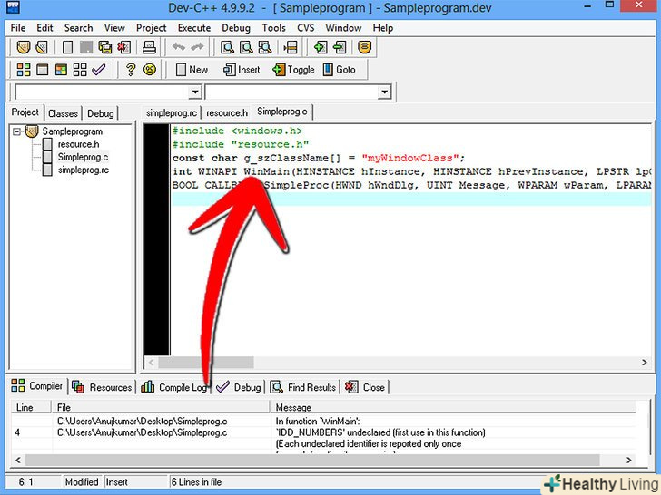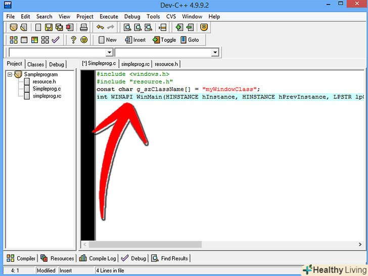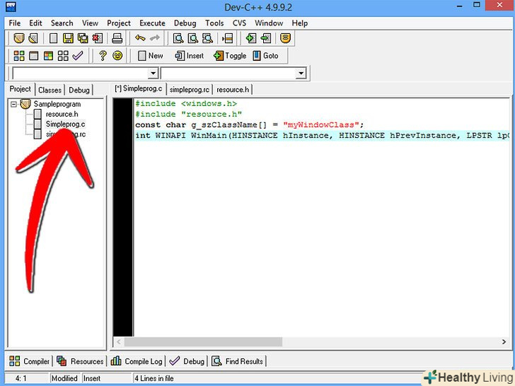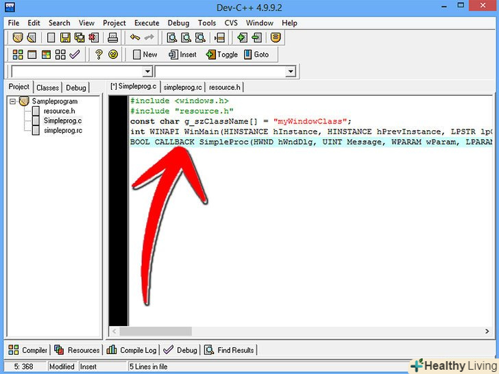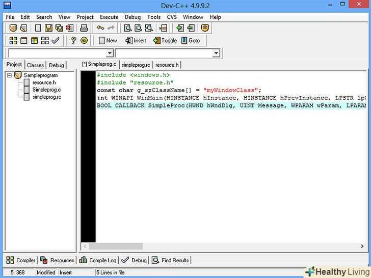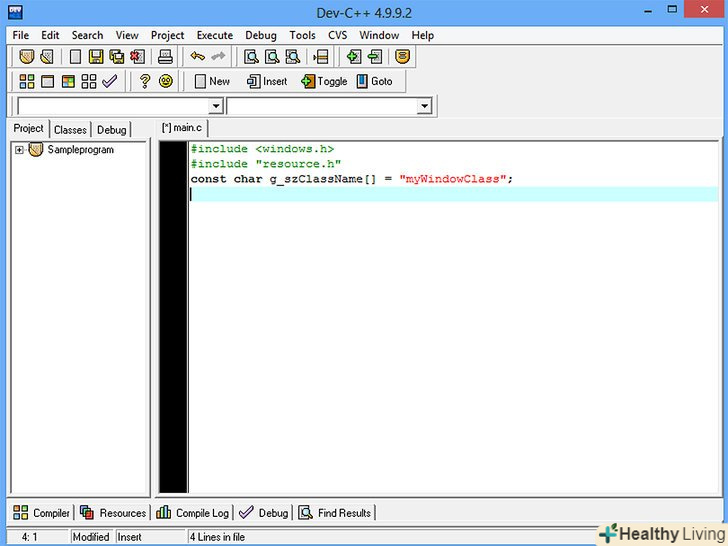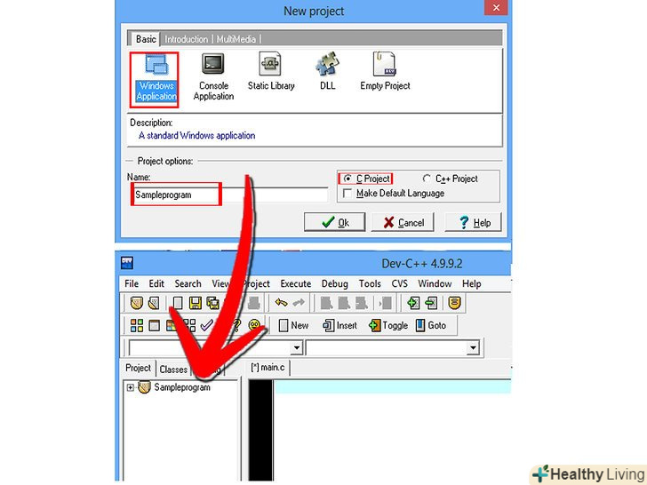 У головному вікні DEV-CPP перейдіть в меню File- gt; New- gt; Project.вам буде запропоновано інше вікно. Виберіть невелику картинку з назвою " Windows Application "і встановіть мову як" C", а не " C++."У текстовому полі, де написано" Name", введіть"SimpleProgram". Далі DEV-CPP запитає вас, куди ви хочете зберегти його. Збережіть файл в будь-якому каталозі, але тільки переконайтеся, що зберегли його. Як тільки закінчите з цим, вам буде представлений шаблон на екрані джерела. Натисніть Ctrl + A, а потім Backspace. Причина, чому ми робимо так, це те, що ми можемо починати заново.