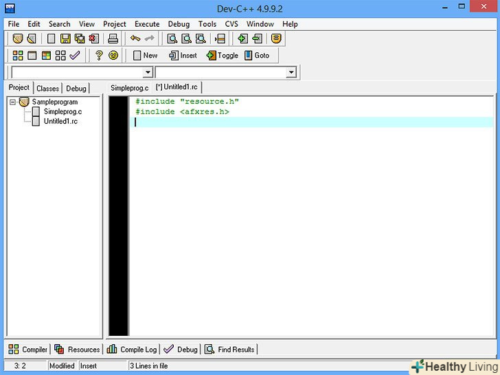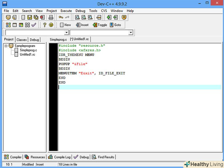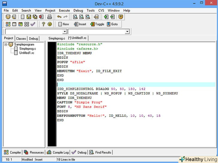 Створіть скрипт ресурсу Resource Script. Resource Script є частиною вихідного коду, який визначає всі елементи управління (наприклад,TextBox, Buttons, і т.д.). Ви включите Resource Script в вашу програму і вуаля! У вас буде програма. Написати Resource Script хоч і просто, але це може зайняти багато часу, якщо у вас немає Visual Editor. Це тому, що вам потрібно буде підрахувати приблизно точні X і Y координати елементів управління і т.д. у головному вікні DEV-CPP перейдіть в меню File -gt; New -gt; Resource File. DEV-CPP запитає вас: "Add resource file to current Project?". Натисніть YES. У верхній частині вашого скрипта ресурсу введіть #include " resource.h", and also type #include lt;afxres.h gt; це стосується всіх елементів управління.