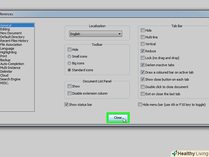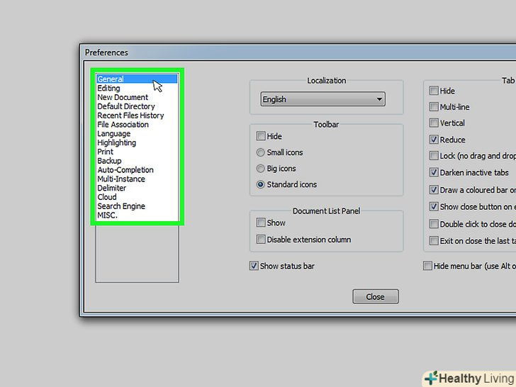 Вивчіть Налаштування Notepad++.перегляньте налаштування в центральній частині вікна або натисніть на одну з вкладок зліва, щоб змінити категорію налаштувань.- Змінюйте налаштування на свій розсуд, але залиште в спокої ті параметри, призначення яких вам не відомо.