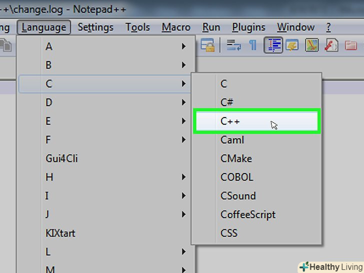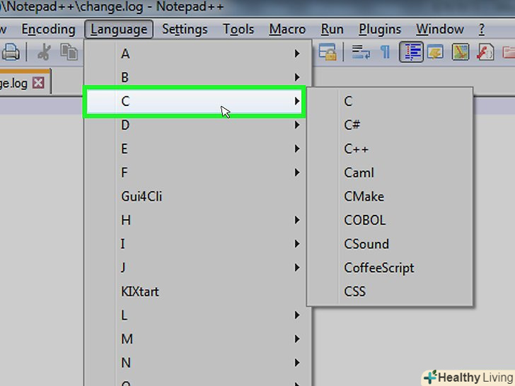 У випадаючому меню "Синтаксиси"Наведіть курсор миші на буквуC, щоб відобразити список мов, що починаються на цю букву.