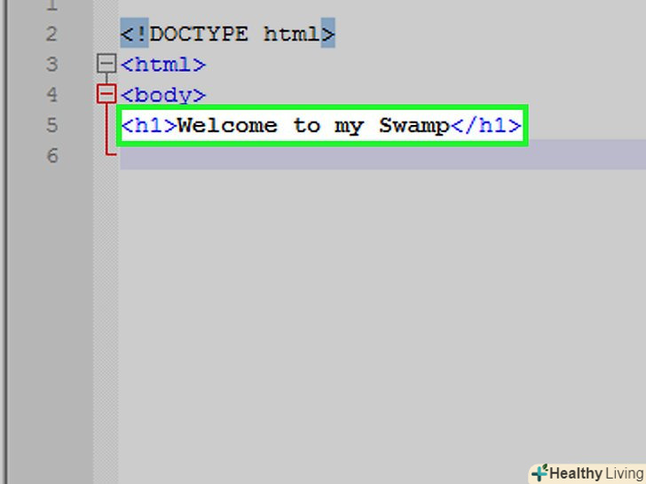 Введіть заголовок сторінки. введітьlt;h1gt;текстLt;/h1gt;і натисніть↵ Enter , замінивши «текст» бажаним заголовком сторінки.- Приклад: щоб оголосити заголовок "Ласкаво просимо в моє болото", введіть