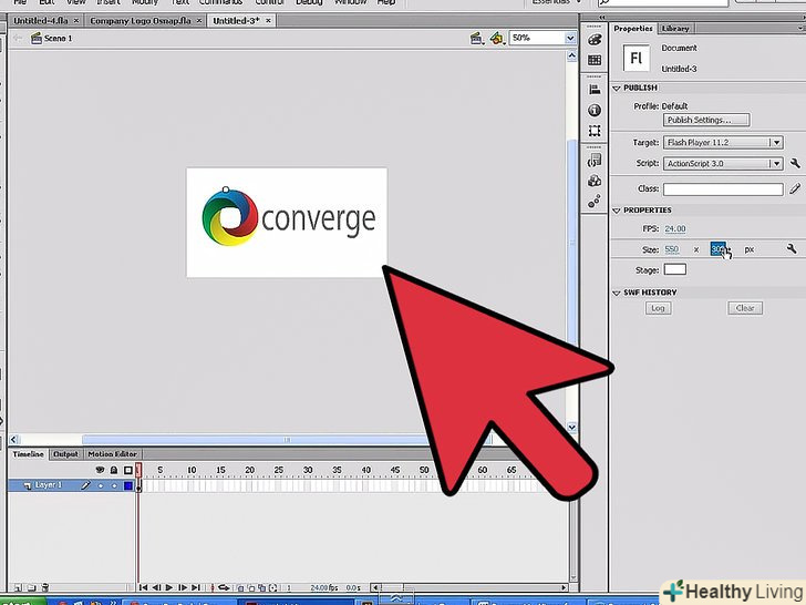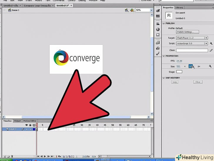 Відкрийте Adobe Flash і створіть новий документ.змініть документ, натиснувши Ctrl + J для Mac, Ctrl + J для ПК. В опціях задайте розмір для банера: 468 х 60 (ширина х висота. Це стандартний розмір банера в Інтернеті). Потім задайте будь-який колір для фону, який ви хочете, і натисніть кнопку ОК. Для цього уроку - це буде чорний колір.