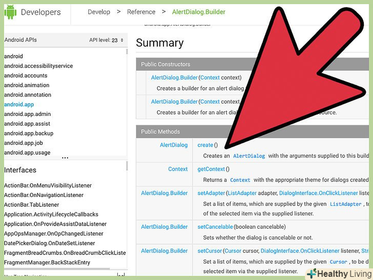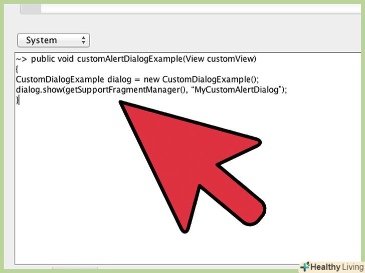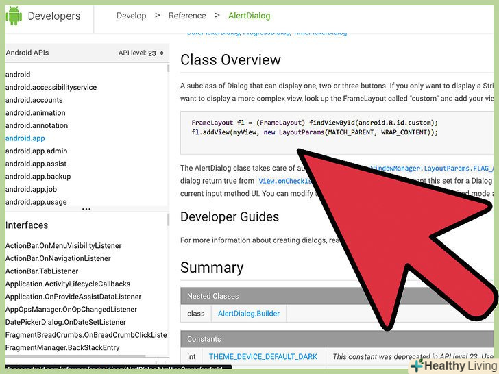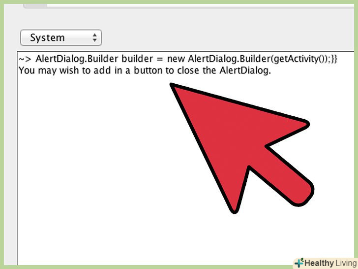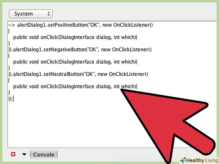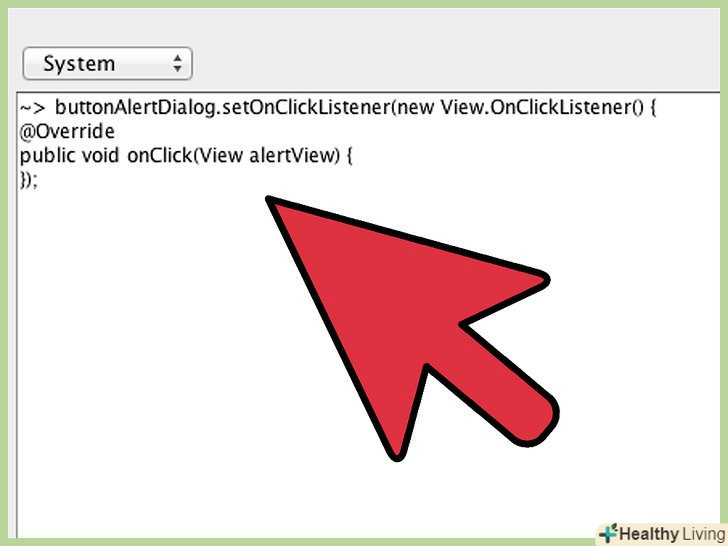 Прослуховуйте активність кнопки. за допомогою OnClickListener можна повідомити програмі, коли користувач натисне кнопку, щоб виконати дію. OnClickListener виконується шляхом прослуховування Введення користувача в ході натискання на відповідну кнопку. Ми будемо використовувати прослуховування для відкриття діалогу AlertDialog.ButtonAlertDialog.SetOnClickListener(New View.OnClickListener() { @Override Public Void OnClick(View AlertView) { });