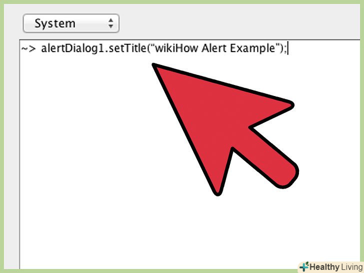 Використовуйте функцію setter для створення заголовка. Функція setter дозволяє надати для об'єкта змінну. Це необхідно, щоб уникнути використання глобальних змінних, що може викликати проблеми з продуктивністю. Заголовок не є обов'язковим, але його можна встановити у верхній частині вікна AlertDialog.AlertDialog1.SetTitle(«Приклад Попередження WikiHow»);