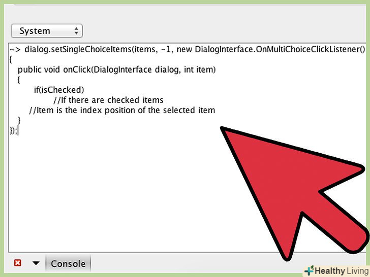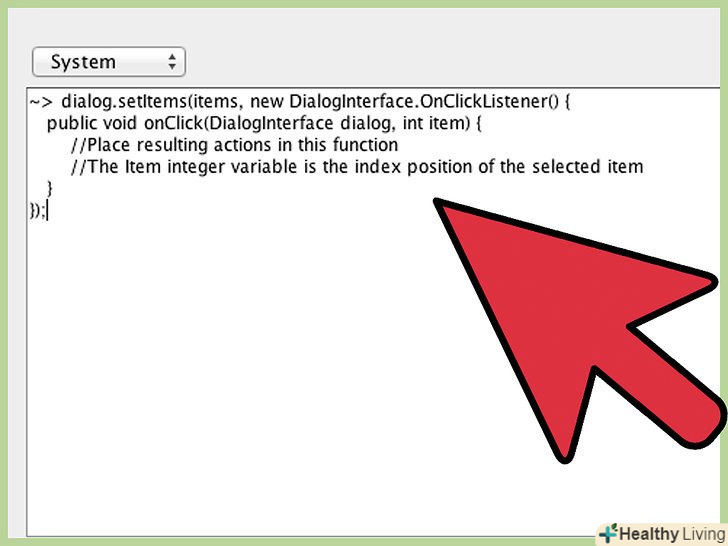 Створіть список AlertDialog. використовуйте setItems для надання списку опцій на вибір. Це вікно з'явиться у вигляді списку перемикачів для перевірки. Для цієї функції буде потрібно вибір з безлічі параметрів і onClickListener для представлення введення користувача.Dialog.SetItems(Items, New DialogInterface.OnClickListener() { Public Void OnClick(DialogInterface Dialog, Int Item) { / / помістіть результат виконання дій у цю функцію //ціла змінна Item відповідає за положення покажчика вибраного елемента } });