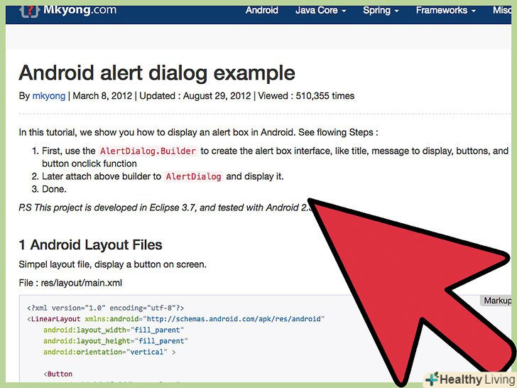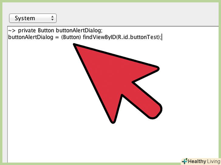 Позначте об'єкт кнопки. об'єкт кнопки допомагає позначити віджет натискання кнопки, як видно з коду XML.[4] в основному java-коді " MainActivity.java " позначає та ініціалізує об'єкт кнопки на початку головного методу, який є основним класом програми.Private Button ButtonAlertDialog; ButtonAlertDialog = (Button) FindViewByID(R.Id.ButtonTest);