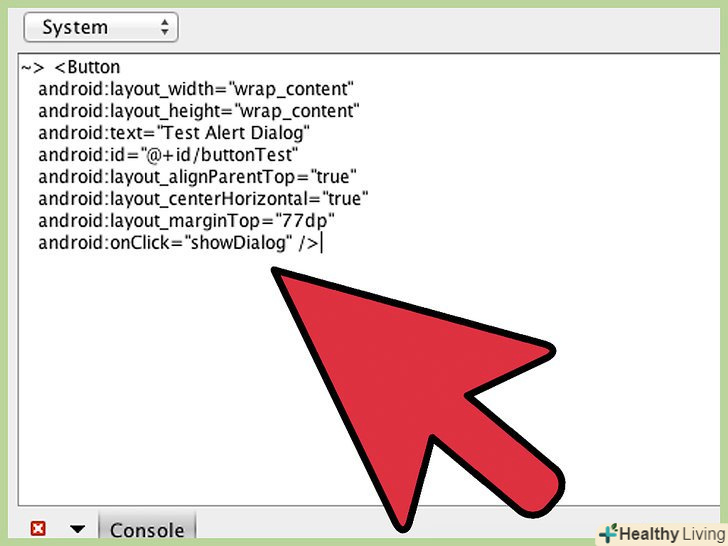 - Кнопку також можна самостійно створити в XML-коді, відредагувавши XML-документ. Зверніть увагу, що рядок, що описує дію onClick, використовується для відображення вікна AlertDialog при натисканні кнопки.