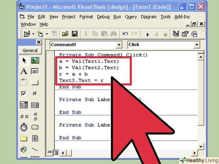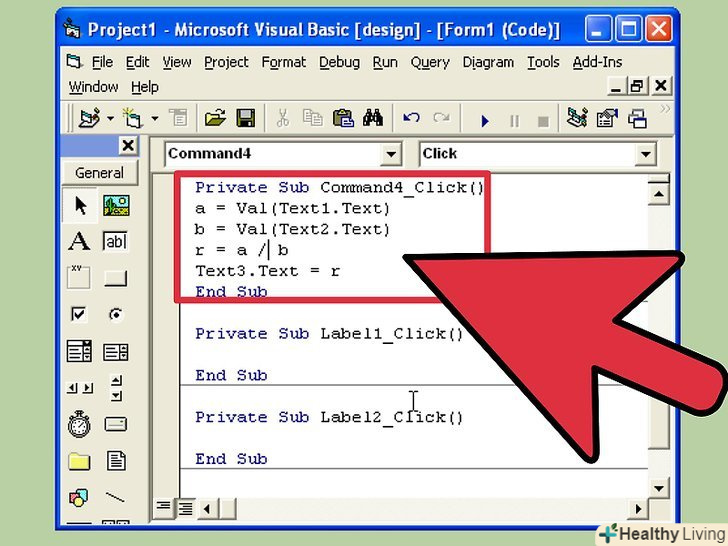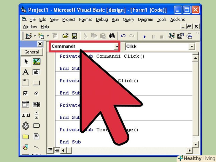 Щоб почати кодування, в Project Explorer натисніть на форму, а потім виберіть крайню ліву кнопку.вас перекине у вікно кодування.- Натисніть на список у верхньому лівому куті вікна кодування. Один за іншим натискайте на всі команди (Command1, Command2, і т.д.), таким чином план кодування з них буде видно вам у вашому вікні кодування.