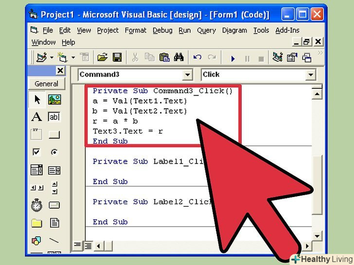 Код для команди множення (Command3). кодування буде виглядати наступним чином:- Private Sub Command3_Click()