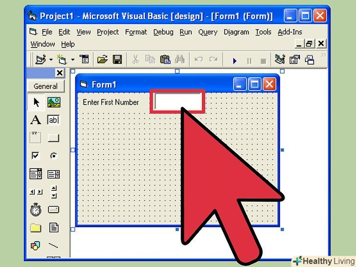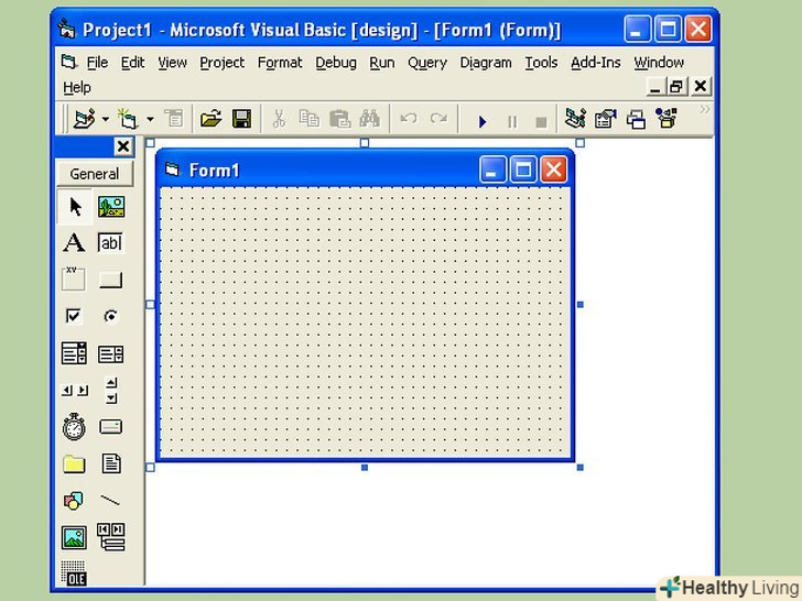 Розгляньте вікно проекту.у центрі екрана буде поле з великою кількістю точок. Це ваша форма.Форма-це місце, куди ви будете додавати різні елементи (кнопки команд, картинки, текстові поля і т.д.) до вашої програми.- Зліва від вікна знаходиться панель інструментів. Панель інструментів містить різні певні заздалегідь елементи будь-якої Програми. Ви можете перетягнути ці елементи на форму.