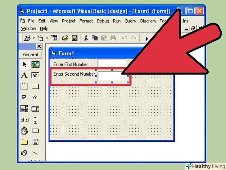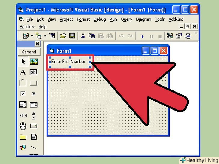 Перетягніть мітку на форму, і змініть заголовок мітки на "Enter first number".- Напис на мітці можна змінити за допомогою вікна властивостей.