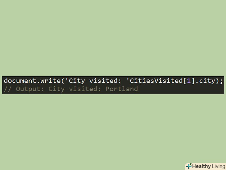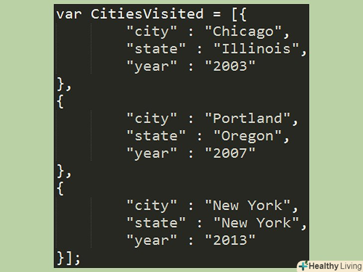 Для декількох об'єктів створіть масиви.ви можете створювати прості бази даних, розміщуючи кілька об'єктів в одному масиві. Це дозволить вам пізніше в програмі використовувати будь-яку частину цього масиву. Ось приклад об'єкта "CitiesVisited", що містить масив міст: