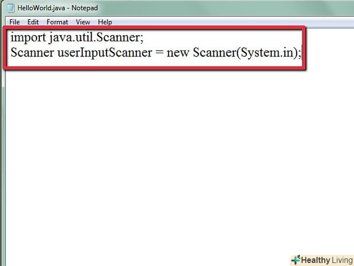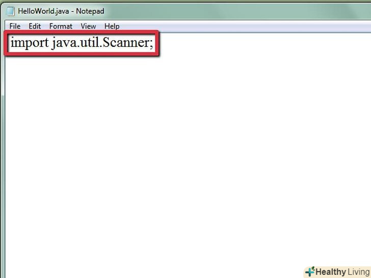 - Імпортуйте клас Scanner. У Java є вбудовані бібліотеки, до яких ми маємо доступ, але нам потрібно імпортувати їх. Однією з таких бібліотек є java.util, що містить Об'єкт Сканер, який необхідний нам для введення даних Користувачем. Для того, щоб імпортувати цей клас, нам потрібно додати наступний рядок у вихідний код.