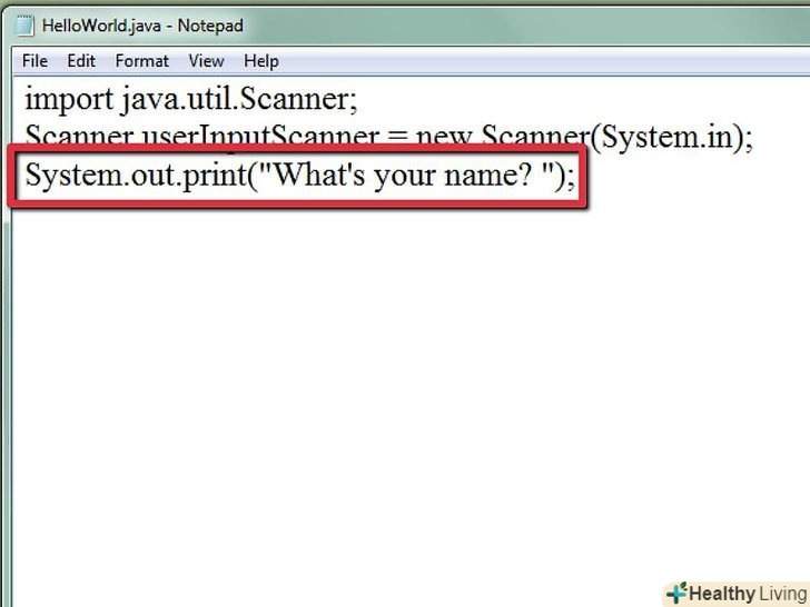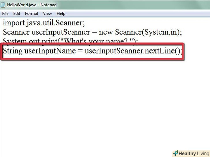 - Зробіть так, щоб об'єкт Scanner підхопив наступний рядок, яку введе користувач, і зберіг її у вигляді змінної. Scanner завжди повинен збирати дані, введені користувачем. Нижченаведена рядок коду буде давати команду об'єкту Scanner розпізнати написане Користувачем ім'я і зберегти його у вигляді змінної: