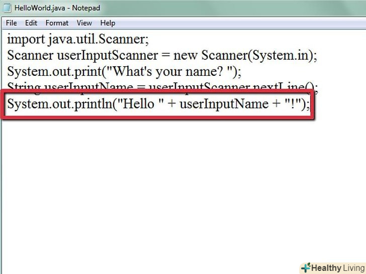 - Необхідно ввести "Привіт", ім'я користувача та знак оклику за допомогою рядка коду