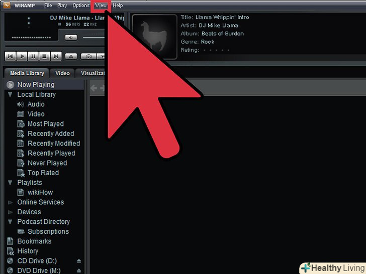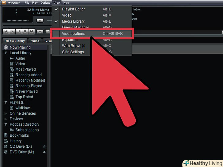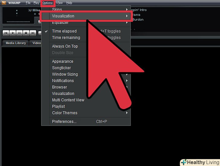 У випадаючому меню виберіть "Visualizations"("зорові образи"). при початку відтворення музики, візуалізація буде відображатися у вікні вгорі над головним вікном Winamp, або в панелі головного вікна.- Включити і вимкнути зорові образи можна за допомогою комбінації клавіш CTRL + Shift + K.