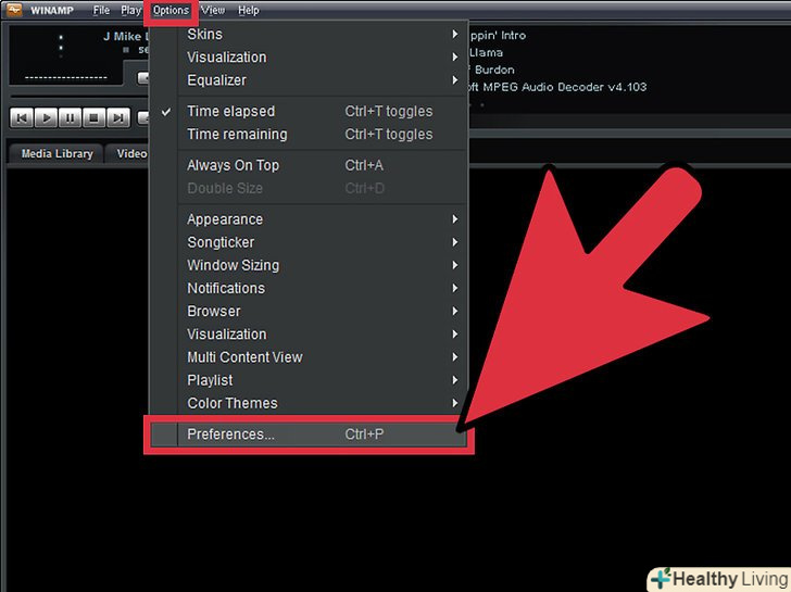 У меню Winamp натисніть рядок "Options"("сервіс").потім натисніть рядок " Preferences "("Налаштування").