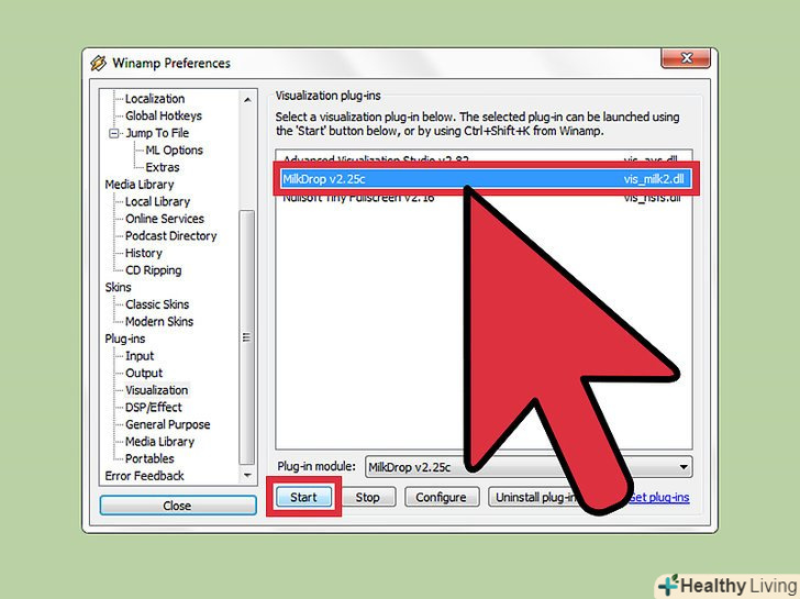 Виберіть модуль зорових образів, який ви хочете використовувати.щоб почати показ візуалізації, натисніть кнопку "Start" ("запустити") в нижній частині вікна.