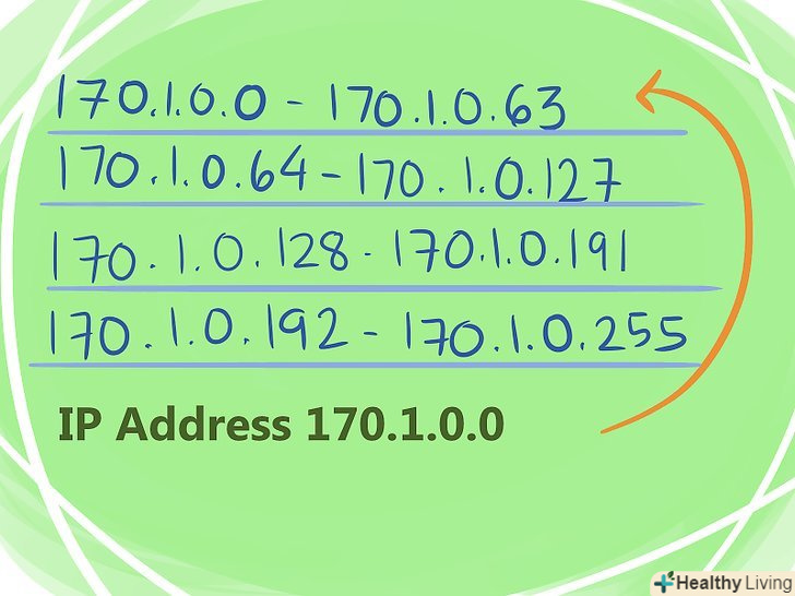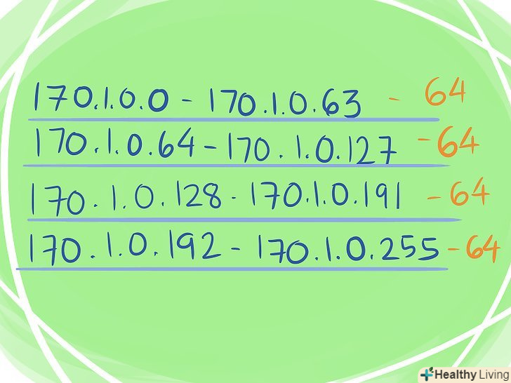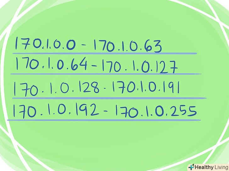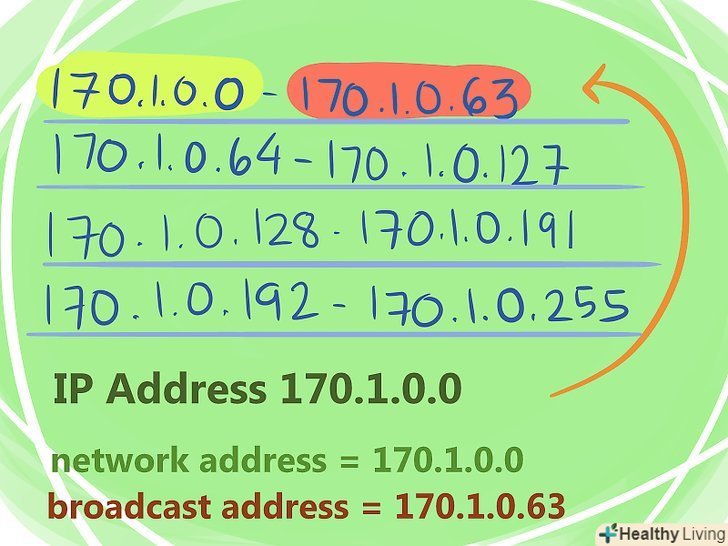 Тепер вам потрібно визначити, в якій мережі ваш IP-адреса. перша Адреса цієї підмережі буде адресою мережі , а остання — широкомовною адресою .- Тут ми вибрали IP-адресу 170.1.0.0. Він знаходиться в підмережі 170.1.0.0-170.1.0.63 (дивіться попередню таблицю). Тому 170.1.0.0-адреса мережі, а 170.1.0.63-адреса для обраного IP-адреси 170.1.0.0.