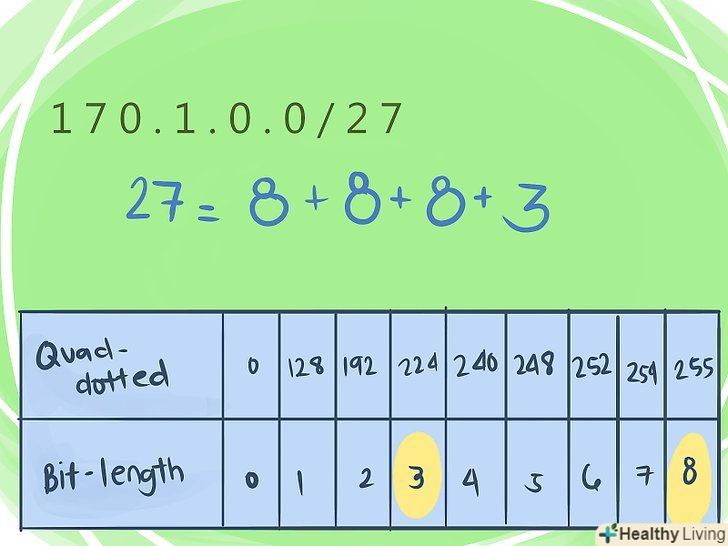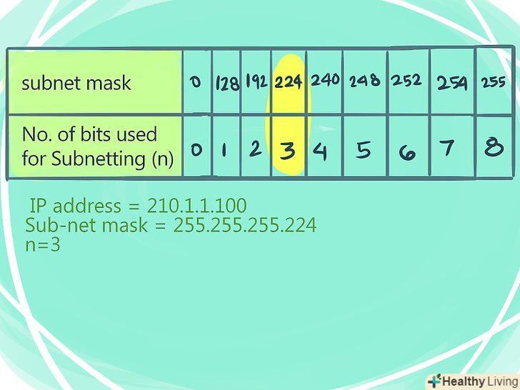 Загальна кількість бітів tb = 8 Число бітів використовується для підмереж n = 3(так як маска підмережі дорівнює 224, а відповідне «число бітів використовується для підмереж» з таблиці зверху дорівнює 3)