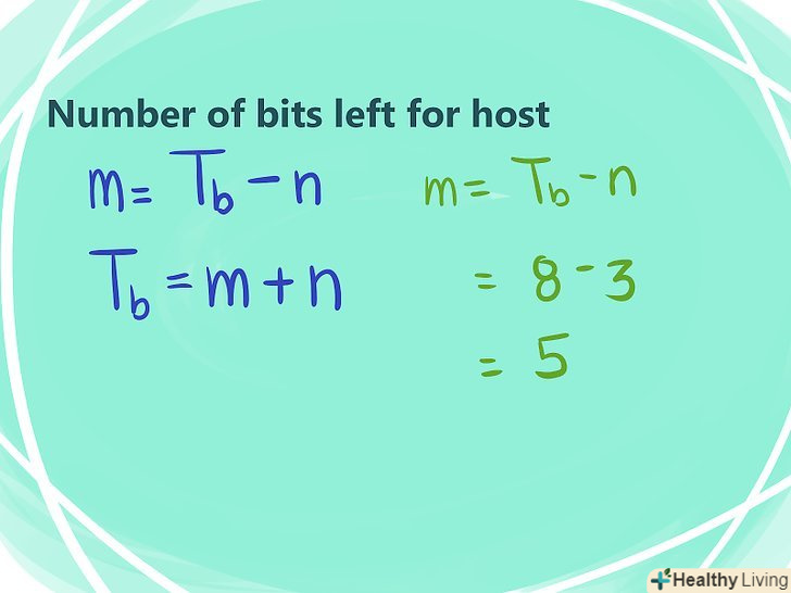 З попереднього кроку у вас є " число бітів використовується для підмереж» (n), і ви знаєтеTb. Тепер ви можете знайти «число бітів, що залишилося для хостів " (m) Рівне Tb - n, так як загальне число бітів — це сума бітів для підмереж і хостів TB = m+n.- Число бітів, що залишилося для хостів = m = TB - n = 8 - 3 = 5