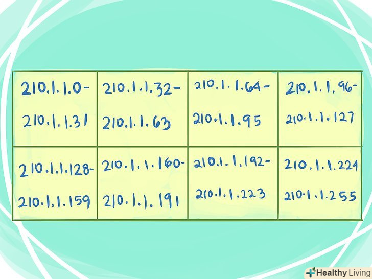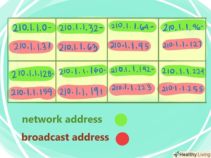 - Тут ми вибрали IP-адресу 210.1.1.100. Він знаходиться в підмережі 210.1.1.96-210.1.1.127 (дивіться попередню таблицю). Тому 210.1.1.96-адреса мережі, а 210.1.1.127-адреса вибраної IP-адреси 210.1.1.100.