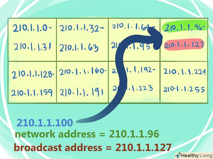 Тепер вам потрібно визначити, в якій мережі ваш IP-адреса. перша Адреса цієї підмережі буде адресою мережі , а остання — широкомовною адресою .- Тут ми вибрали IP-адресу 210.1.1.100. Він знаходиться в підмережі 210.1.1.96-210.1.1.127 (дивіться попередню таблицю). Тому 210.1.1.96-адреса мережі, а 210.1.1.127-адреса вибраної IP-адреси 210.1.1.100.