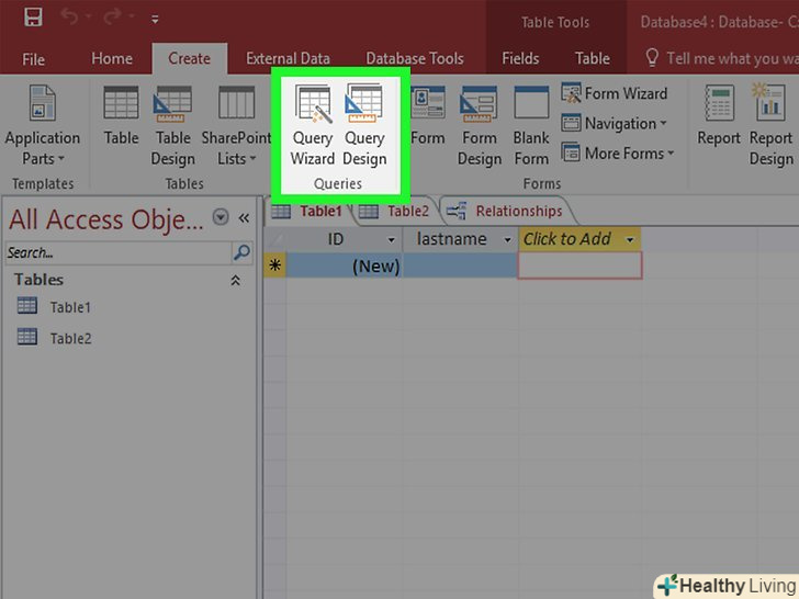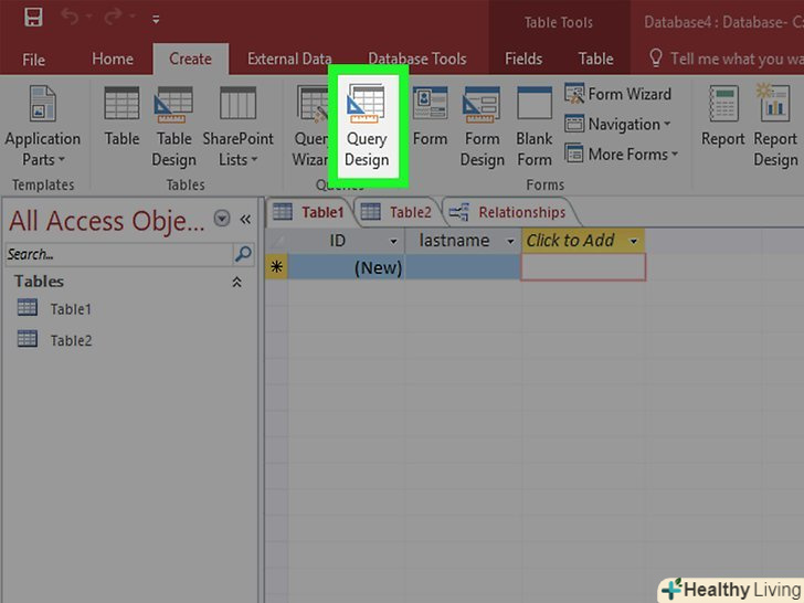 У вкладці "створення" натисніть "Конструктор запитів". ви можете використовувати запити для отримання вибраної інформації з уже існуючих таблиць або можете створювати нові таблиці з цією інформацією. Це буде особливо корисно, якщо ви хочете поділитися будь-якою частиною бази даних або створити особливі форми для підрозділів вашої бази даних. Для початку вам потрібно створити звичайний запит на вибірку.
