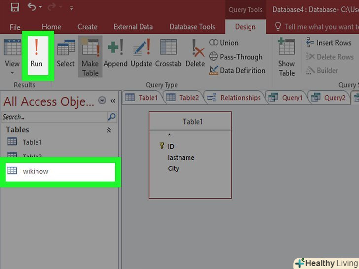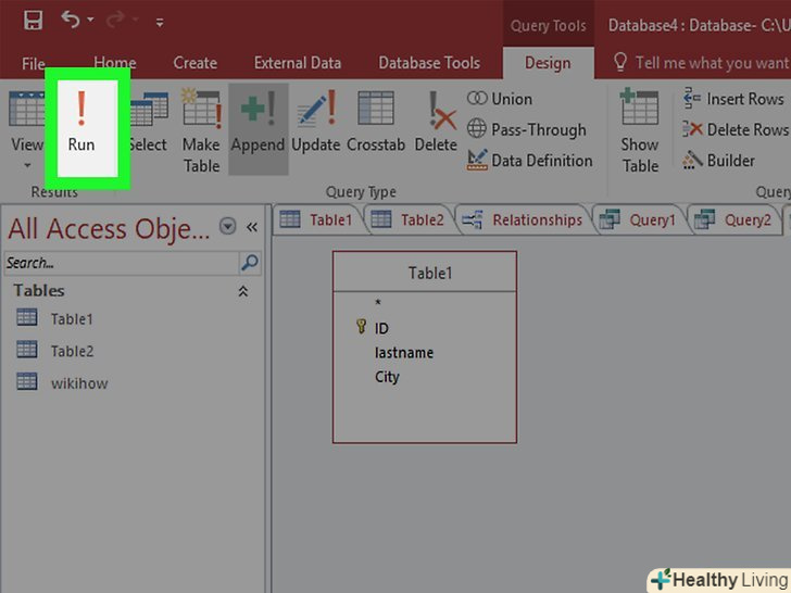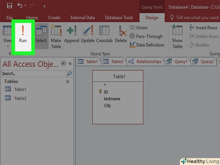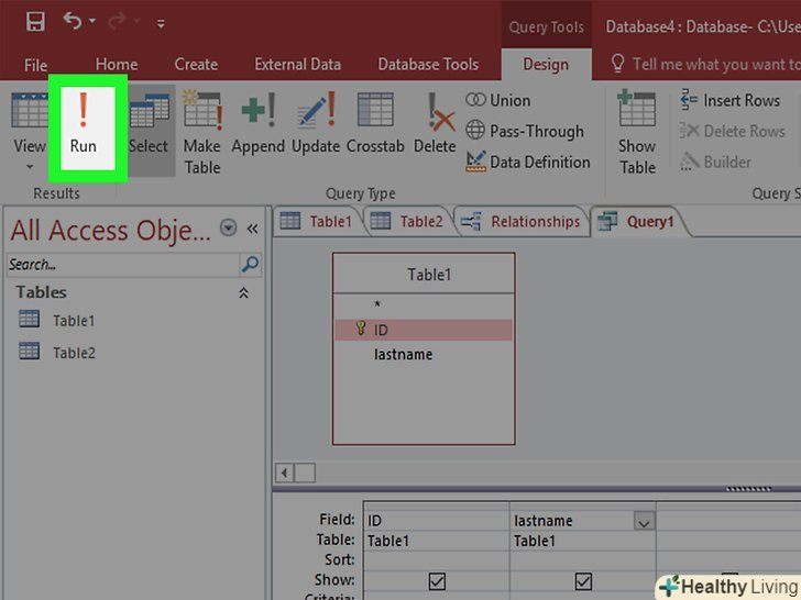 Натисніть "Виконати", щоб побачити результати. Кнопка «виконати» у вигляді знаку оклику знаходиться у вкладці «Конструктор». Результати запиту будуть виведені в окреме вікно. Натисніть Ctrl + S, щоб зберегти результати запиту.