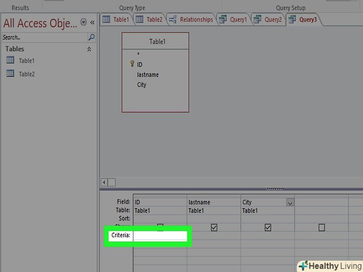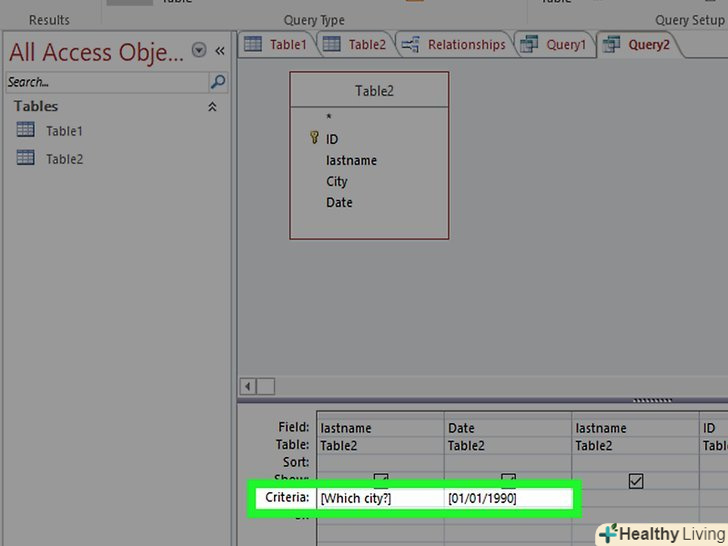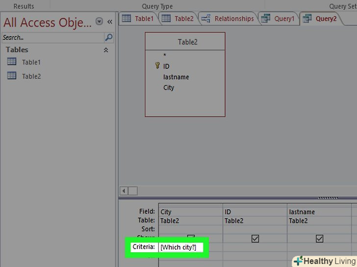 Додайте параметр до розділу критеріїв. Параметри розділені між собою дужками" []" » Текст всередині дужок буде виведений в рядок, який з'явиться під час проведення запиту. Наприклад, для запиту міста клікніть по осередку критеріїв в поле міста і введіть[яке місто?].- Параметр може закінчуватися на «?"або":«, але не"!» або «.»