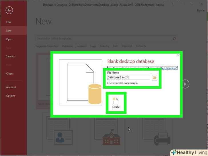 Назвіть свою базу даних.вибравши тип бази даних, назвіть її відповідно до призначення. Це буде особливо корисно, якщо ви працюєте одночасно з декількома різними базами даних. Введіть назву в поле "Ім'я файлу". Натисніть "Створити", щоб згенерувати нову базу даних.