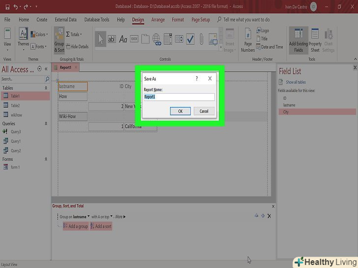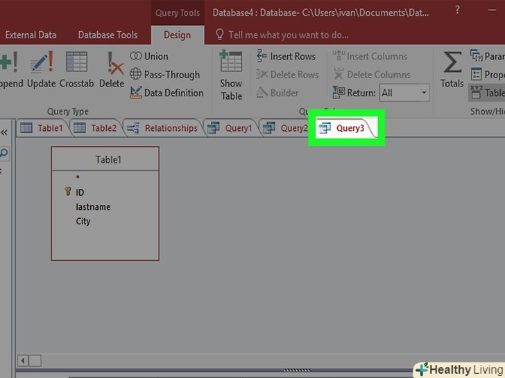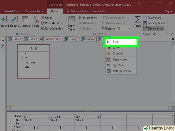 Збережіть запит. натисніть Ctrl + S, щоб зберегти запит для подальшого використання. Він з'явиться в колонці навігації в лівій частині екрана. Якщо ви натиснете на цей запит, ви зможете використовувати його знову, потім перейдіть на вкладку "Конструктор".